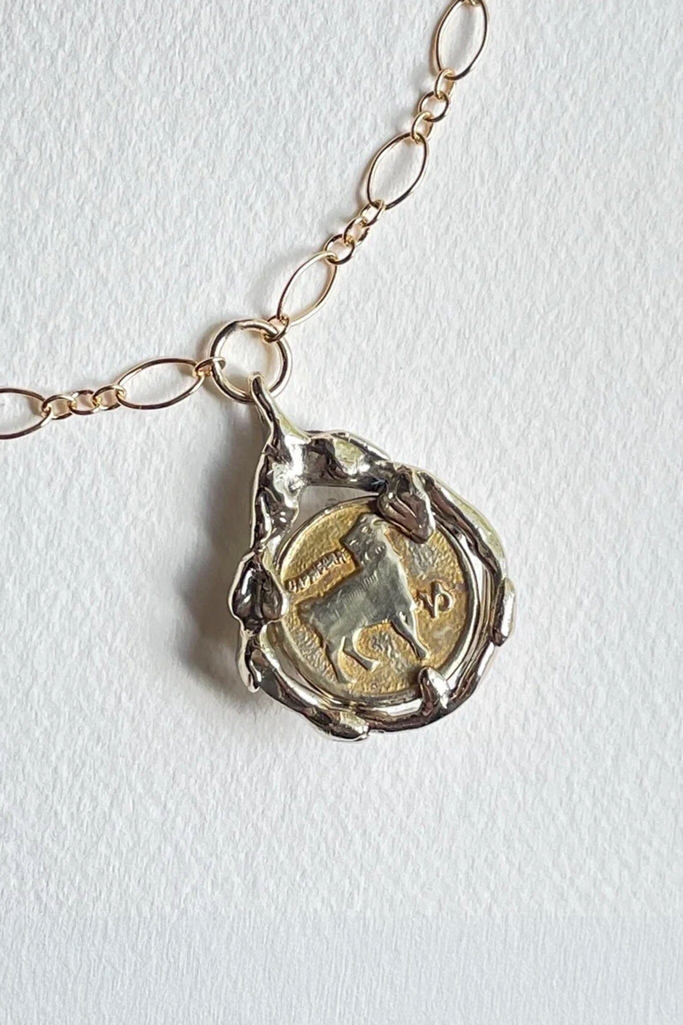 Regular price $ 110.00Individual vintage zodiac coin charms are made for layering on your favorite mm/dd/yyyy necklace to remind you of your Sun, Moon, and Rising signs. Or perhaps add a vintage coin on your favorite jewels to represent each of your loved one's stars? Each coin loop is large enough to be strung onto your favorite heirloom charm necklaces and bracelets.