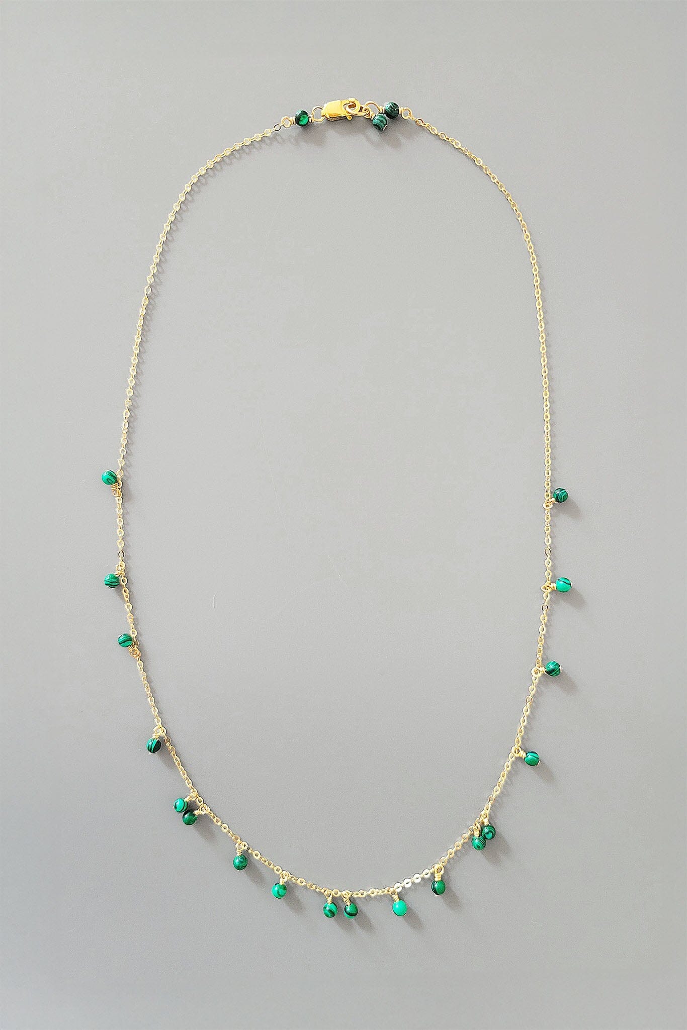 Dainty malachite briolettes on a gold-filled chain and clasp.