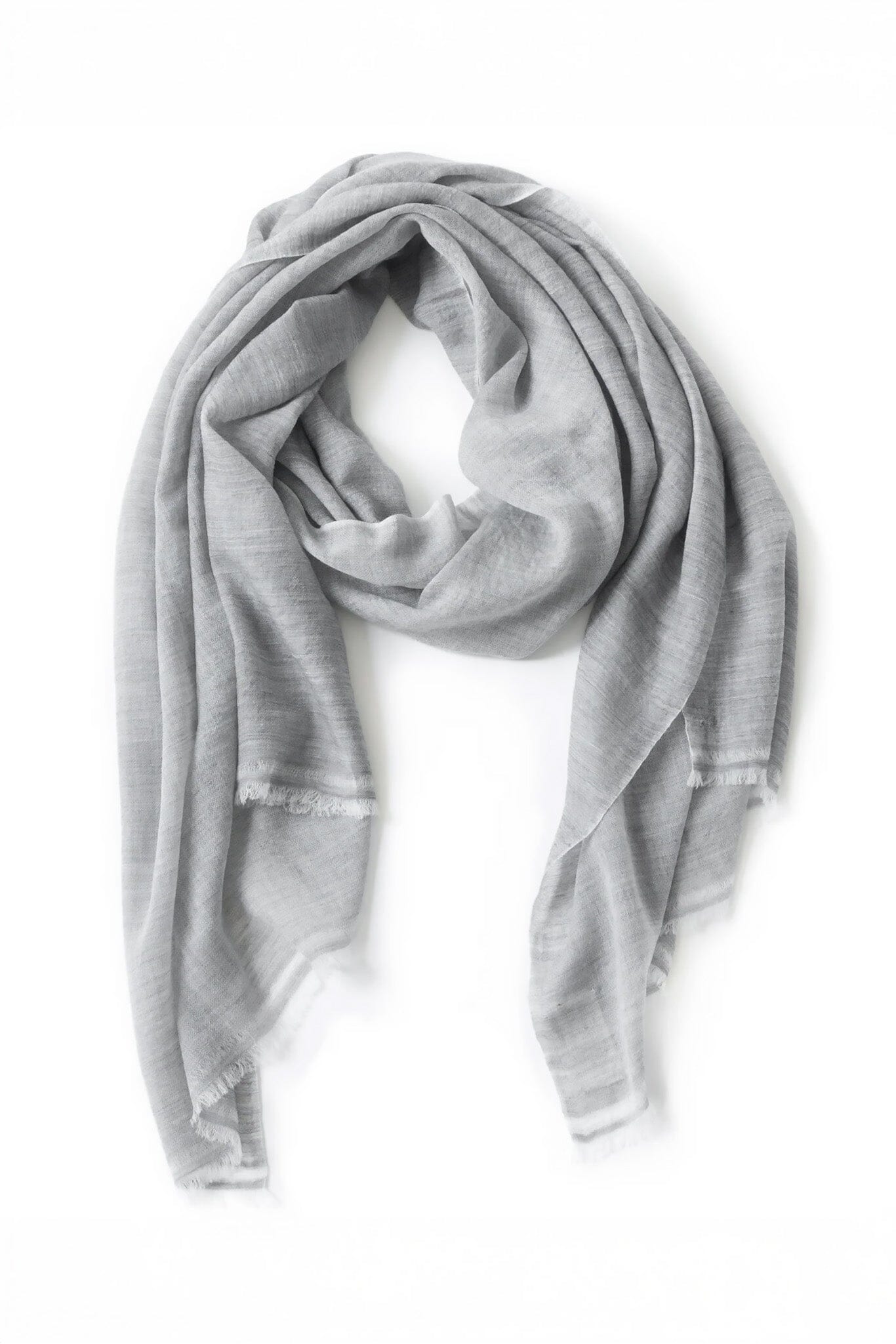 Master artisans hand weave this merino wool scarf with super fine melange strands in the weft and white in the warp to create the subtle textual variation. The edging has a raw detail kept as a remnant from the weaving process.