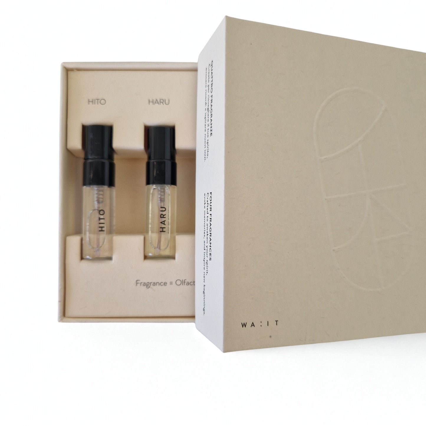 Discover the essence of WA:IT through a curated selection of our four functional fragrances — HITO, HARU, AKA, and LUCE.