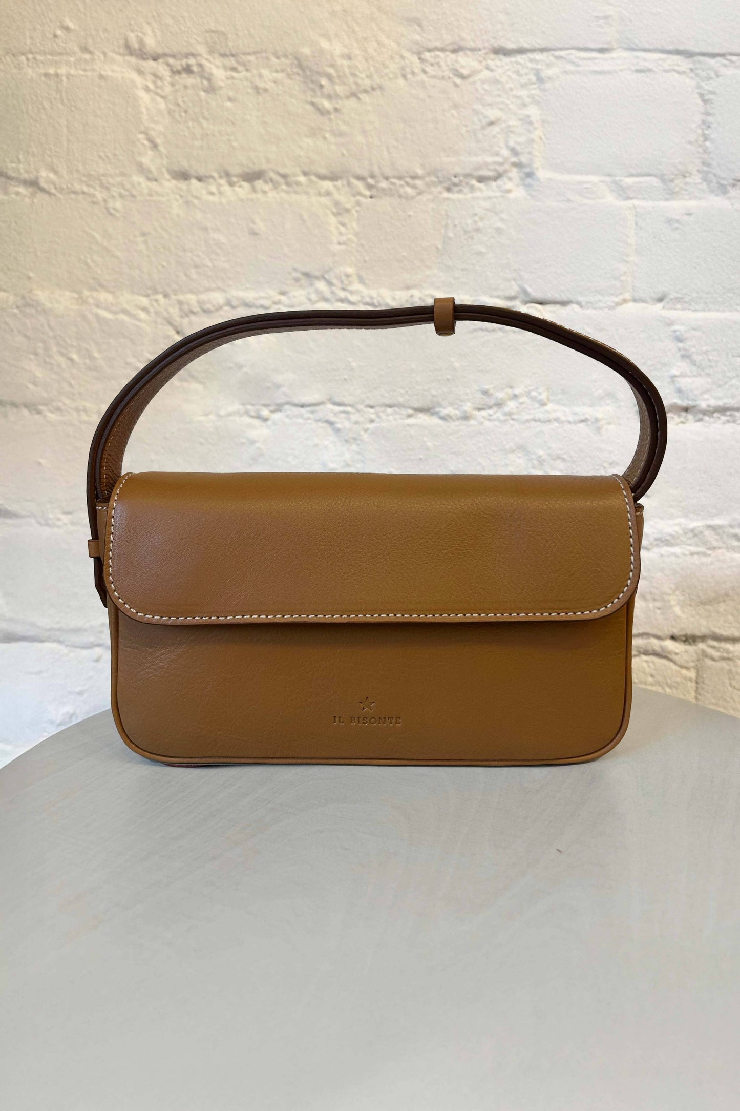 Small bag in vegetable tanned cowhide leather which can be worn two ways, over the shoulder or crossbody. Adjustable shoulder strap with buckle. Magnetic button closure hidden under the flap. Under-flap in leather. Inside is lined in cotton canvas and contains an open mobile phone pocket. 100% made in Italy and produced in the province of Florence by master artisans in Il Bisonte's 30-Km supply chain.