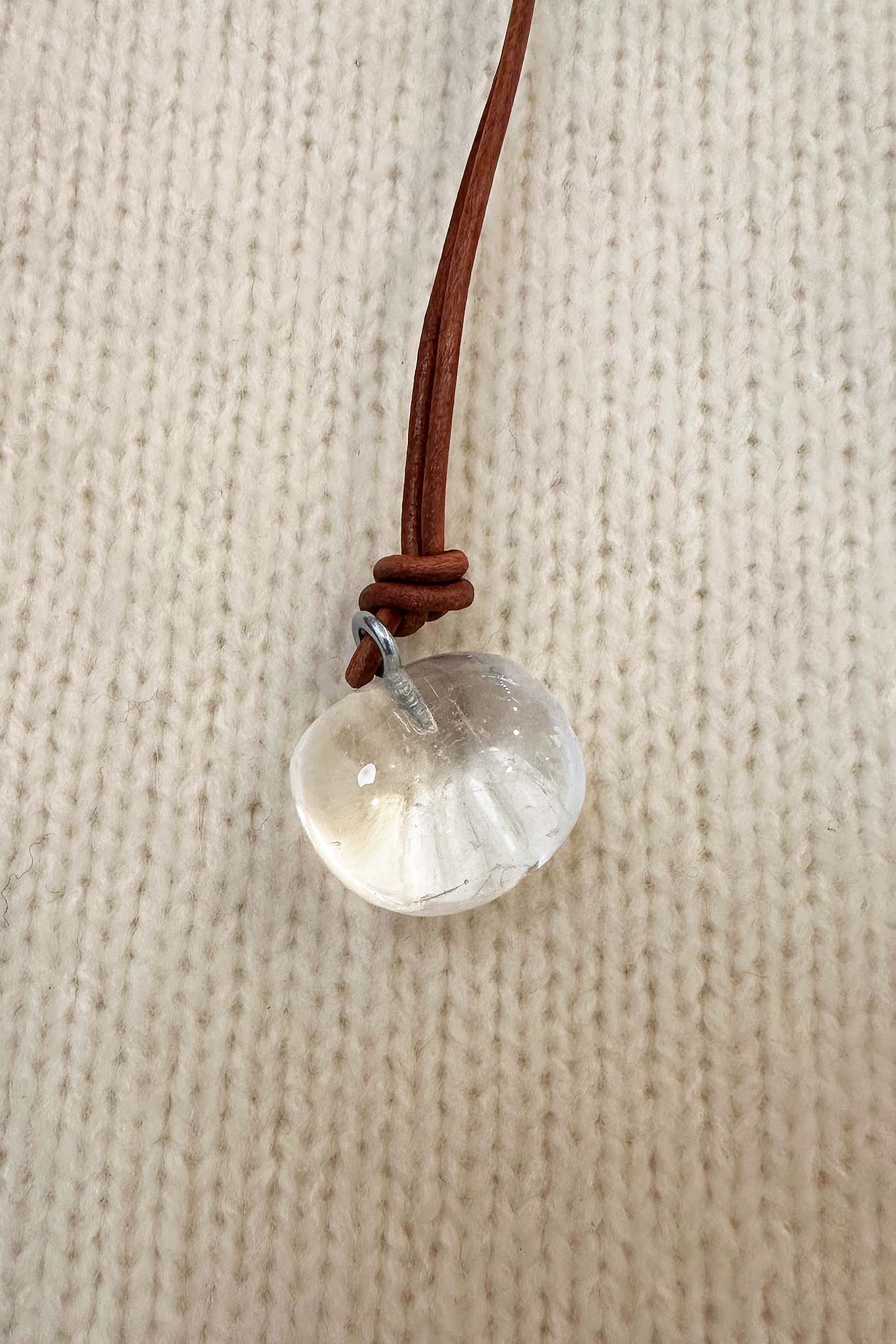 Necklace with a clear round crystal pendant and brown leather cord on a textured beige background