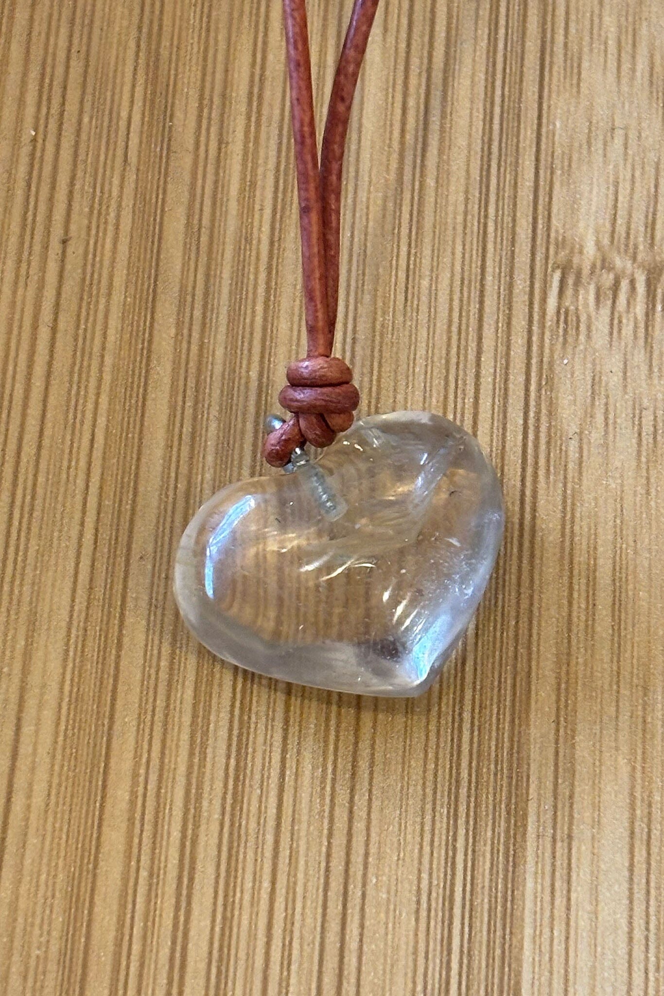Large, clear crystal stone on knotted light brown leather cord. Each necklace comes packaged in a muslin cloth bag.