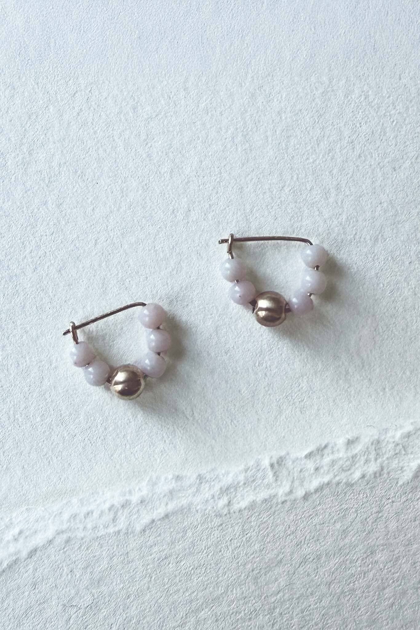 Delicate vintage pink shell beads paired with luminous 14k gold balls form these timeless huggie earrings. Soft in color yet refined in design, they’re lightweight, easy to wear, and perfect for everyday elegance with a hint of vintage charm.
