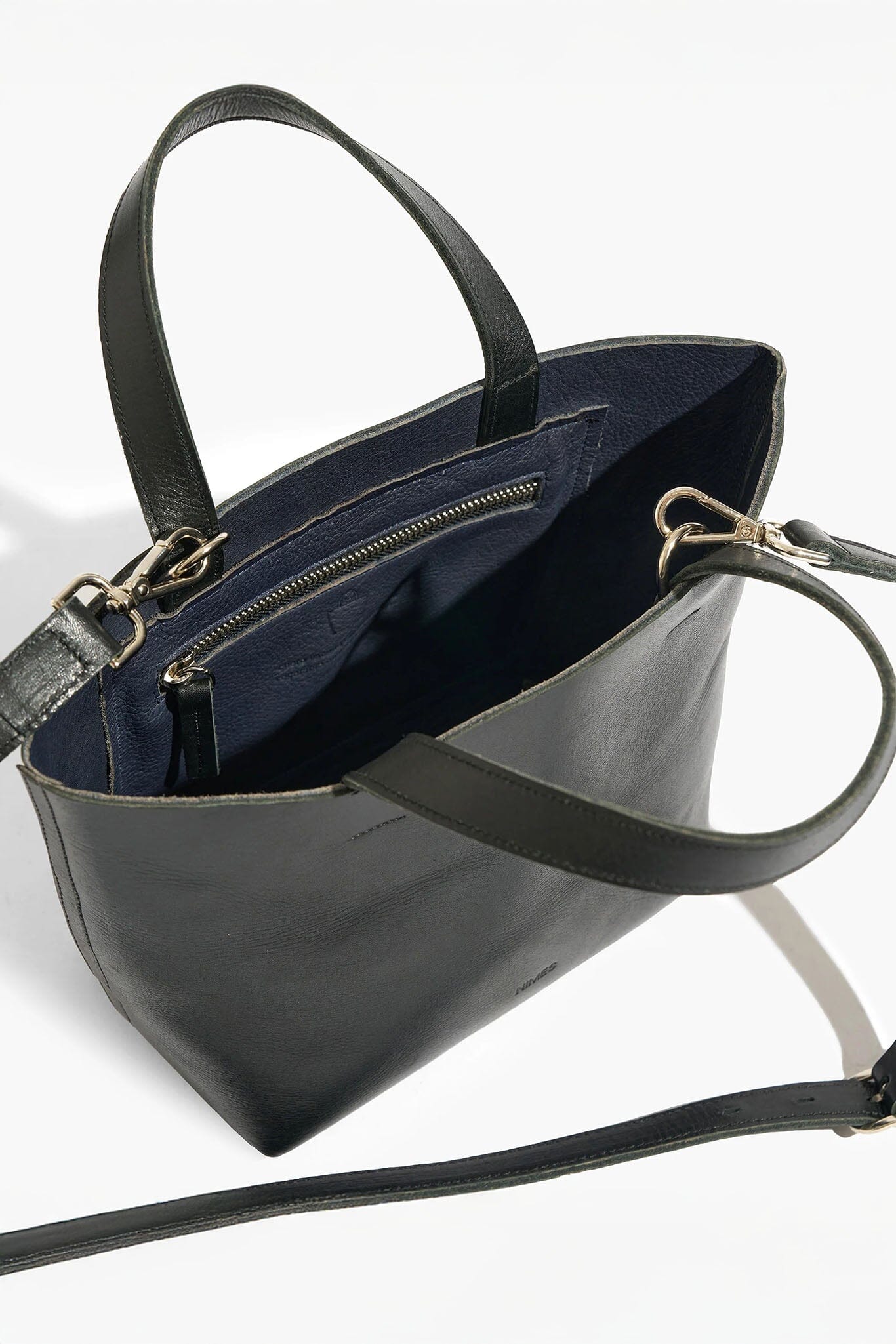Crafted from smooth, vegetable-tanned natural leather, this handbag features a small debossed ‘NIMES’ logo, a removable, adjustable leather strap, an internal zippered pocket, and a contrasting black grain leather interior.
