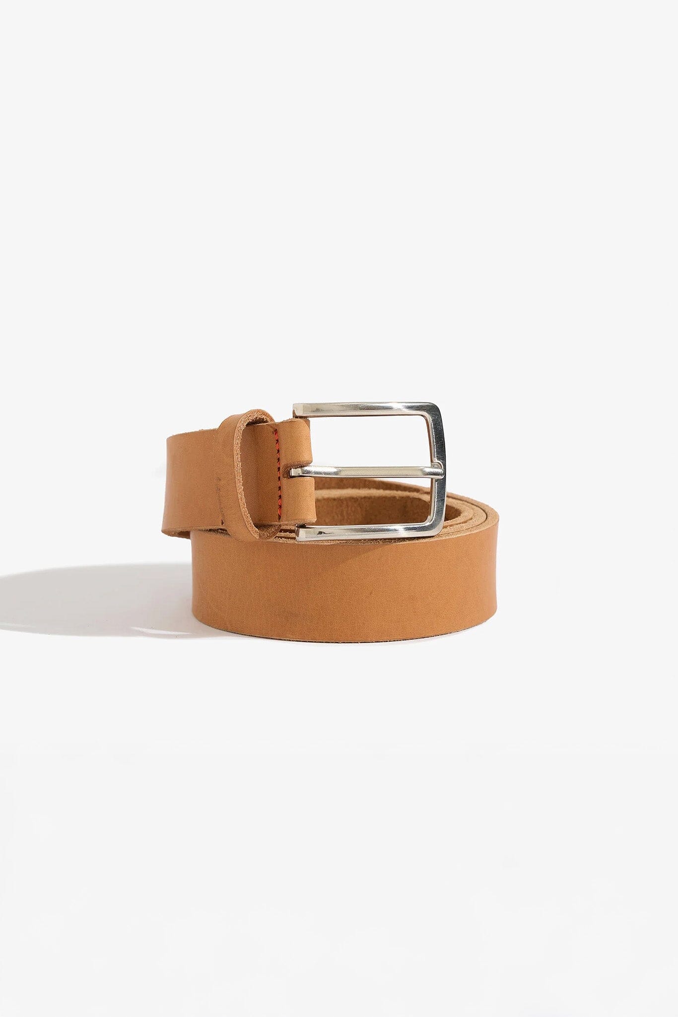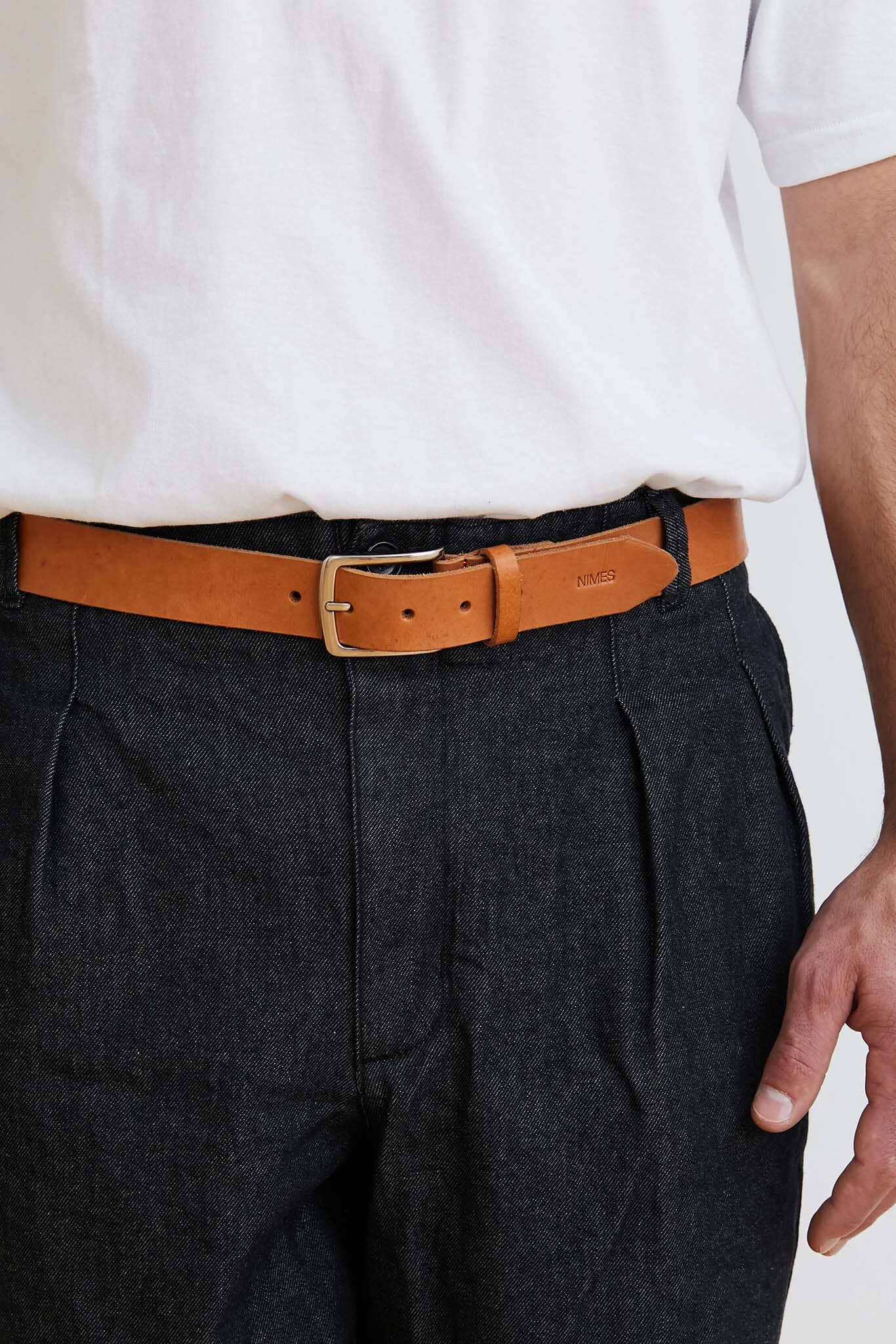 Crafted from smooth, vegetable-tanned natural leather, this belt features a silver buckle and a small debossed ‘NIMES’ logo at the outer end of the belt.