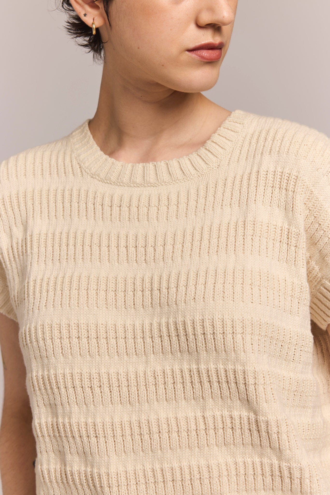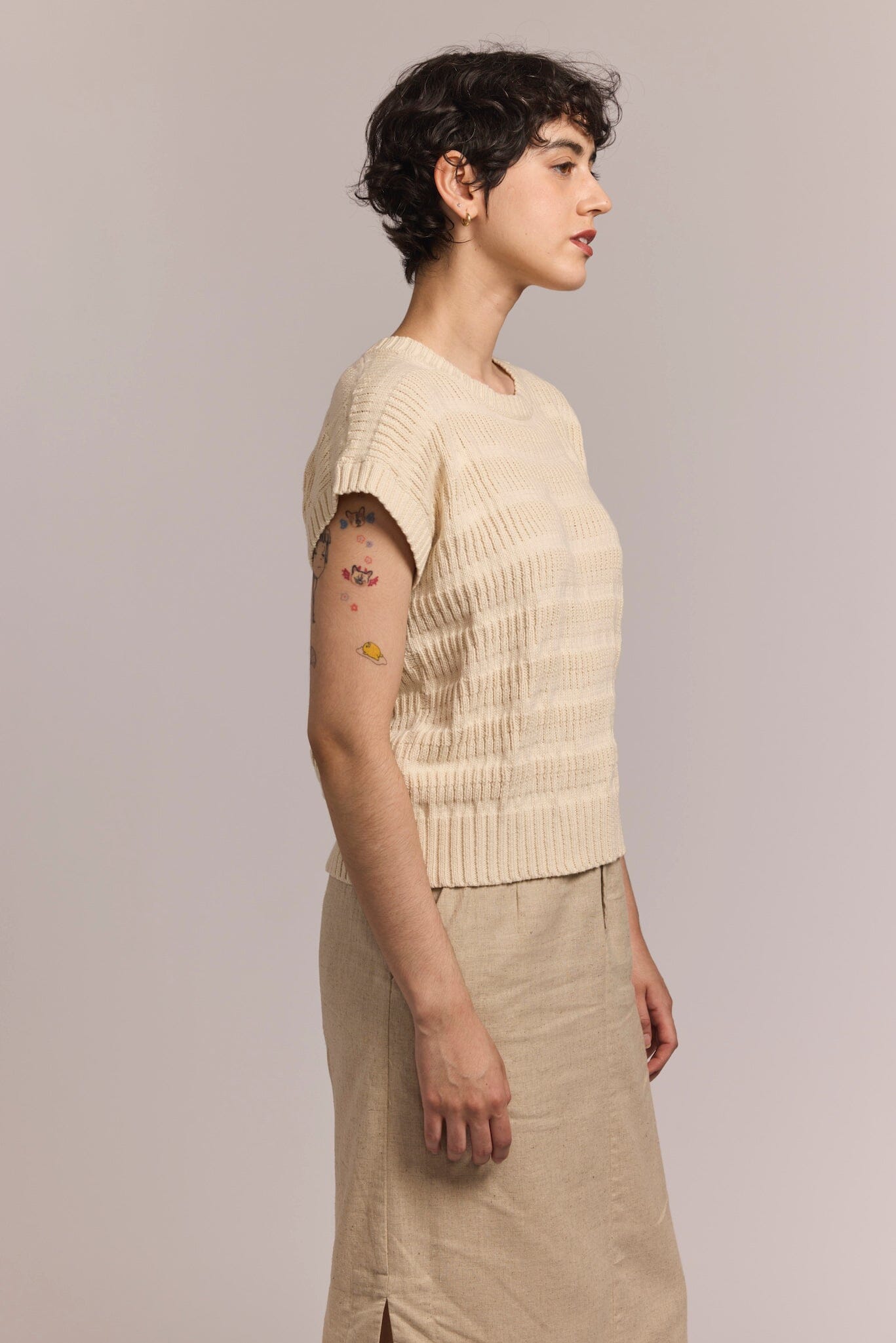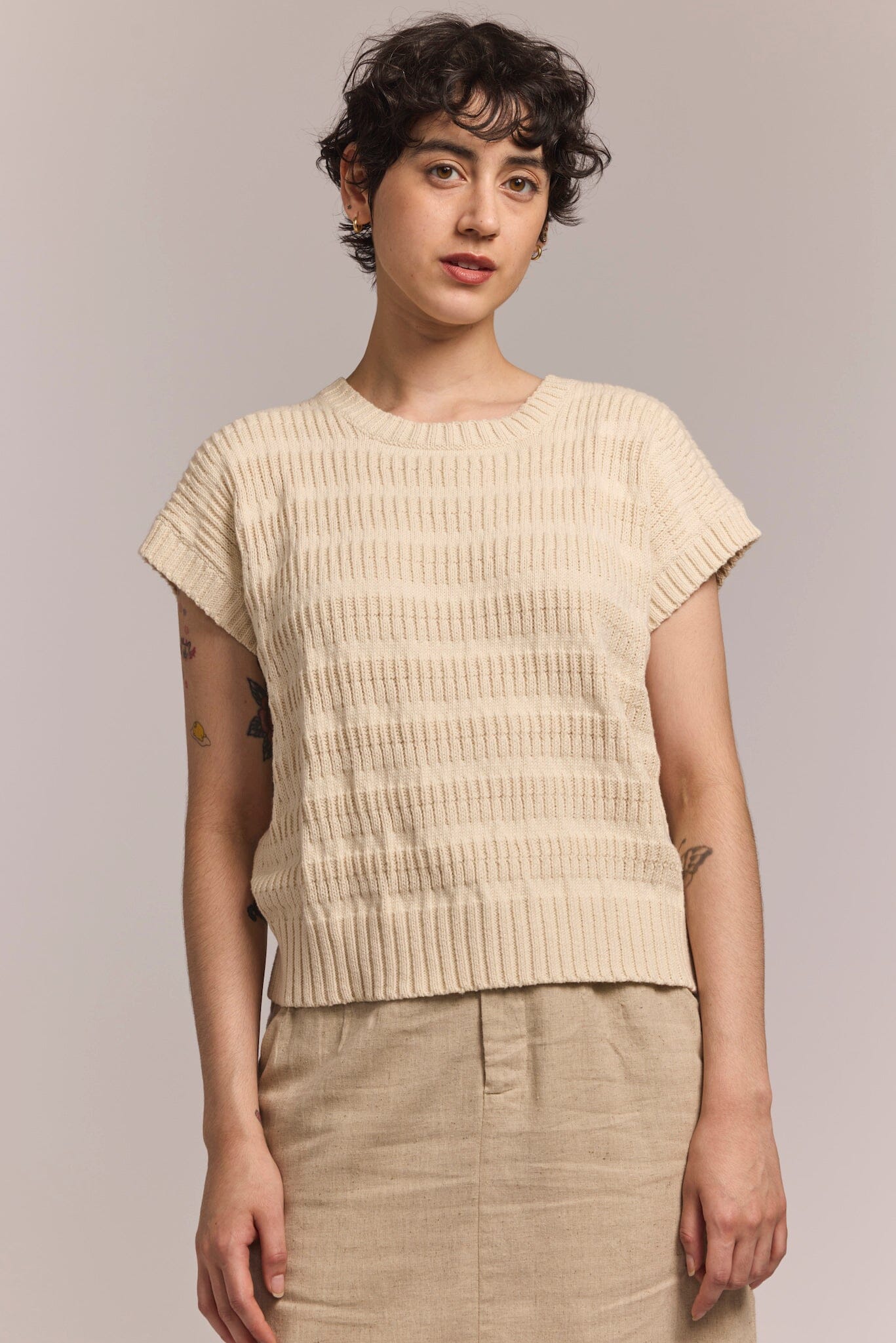 Hand machine knit with soft 100% cotton, the Charlotte Top is a lightweight textural sleeveless sweater that is a perfect addition to your versatile wardrobe. Wear it to the office or for a weekend brunch and pack it for a vacation away. Sleeves hit at the high bicep. Hem hits at the hip. Fair trade certified.