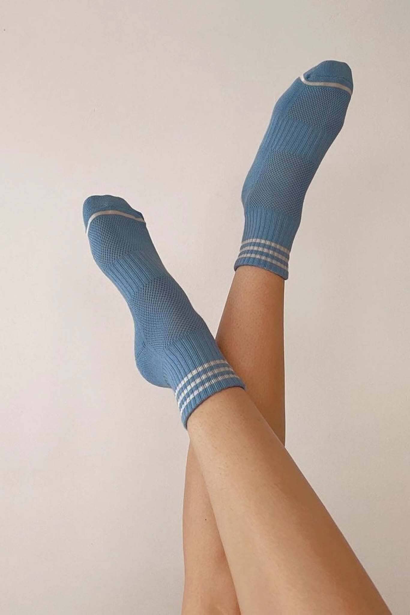 The Girlfriend Socks features a triple contrast stripe at the opening and a shorter classic crew sock length. She is a universally quintessential sock.
