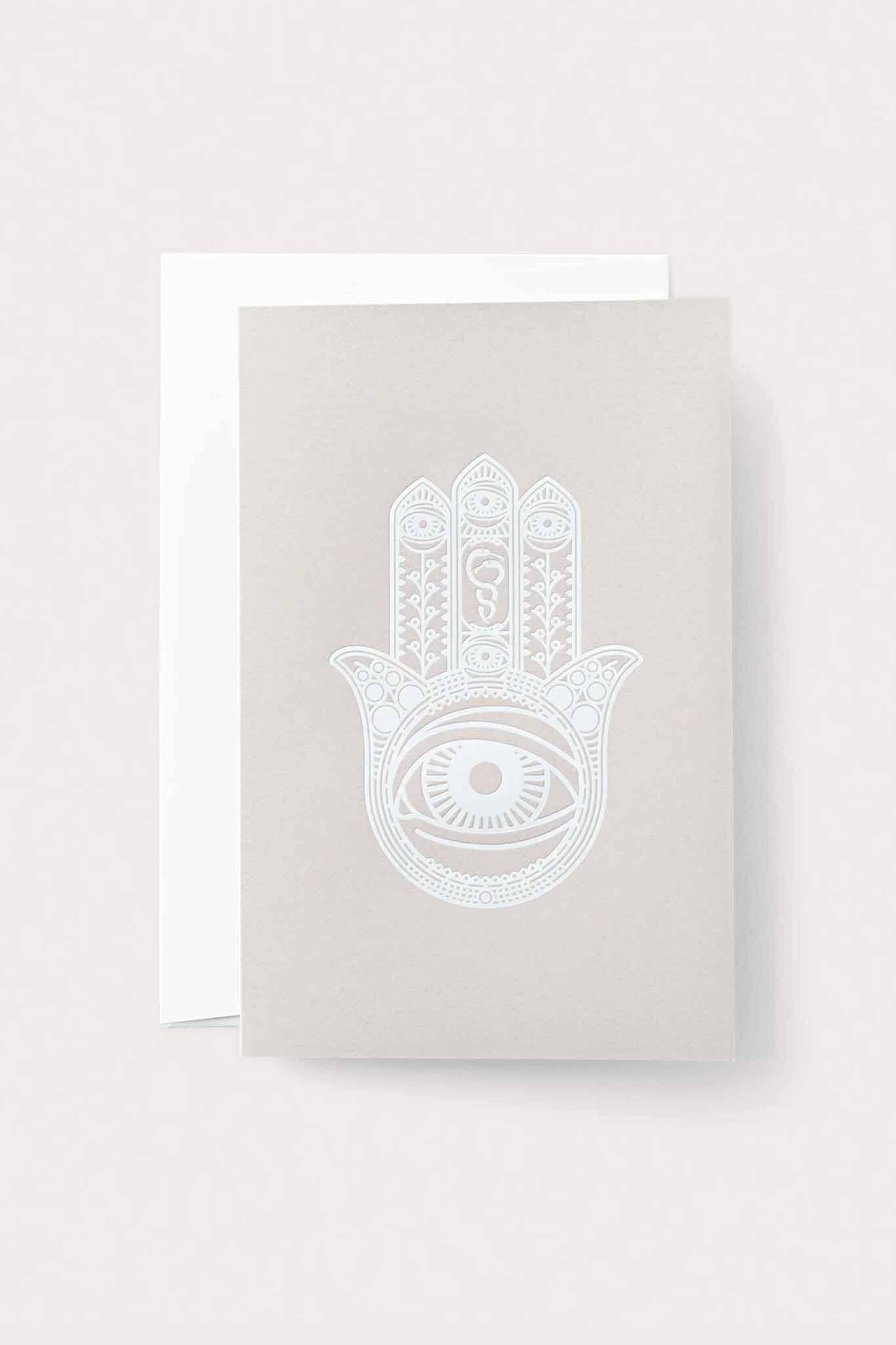 Widely used as a protective talisman, this hand represents Tanit, a goddess of the lunar cycle. Foil stamped by third generation New England craftsmen, on American paper, milled using hydro-power. Custom card size 4.75” x 7.25”. Signature Noat envelope. Limited edition.