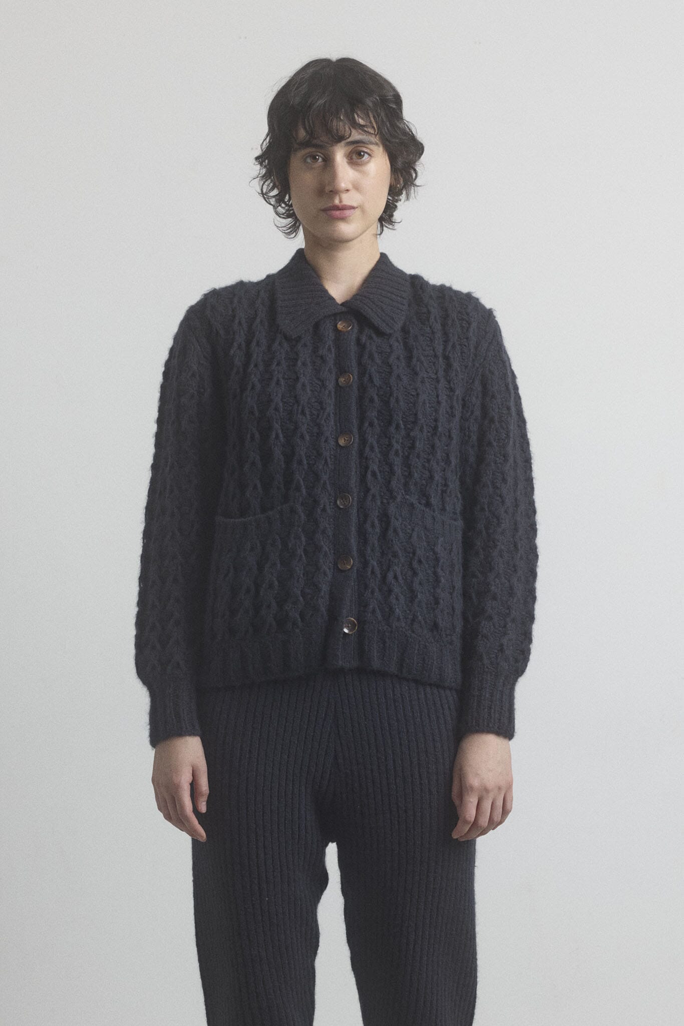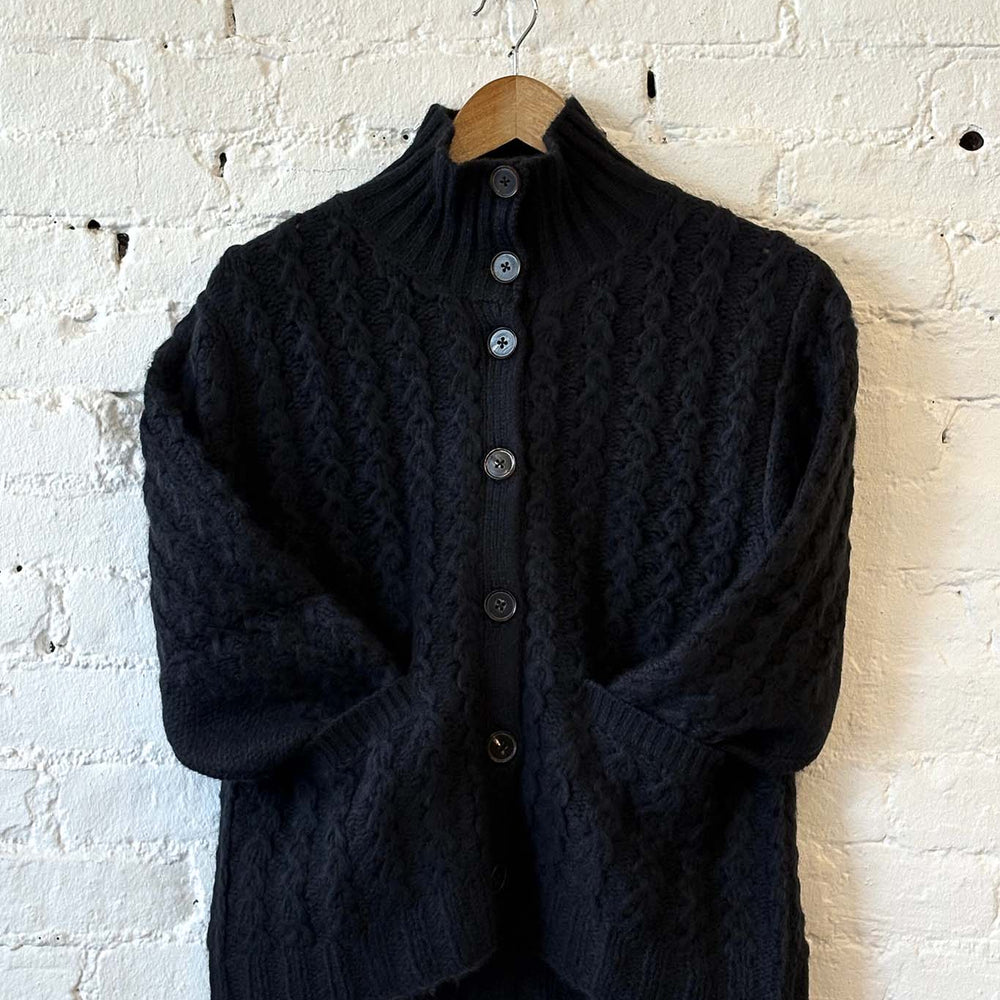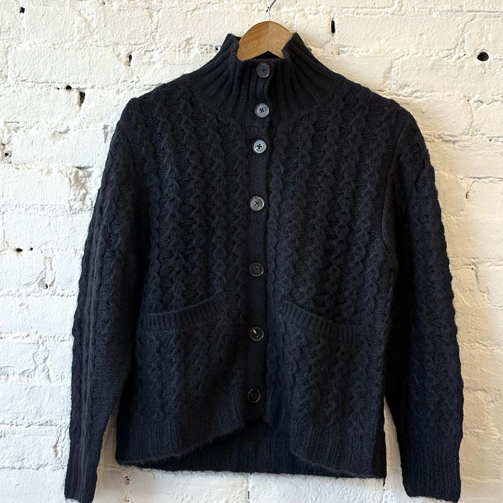 Textural hand knit merino cashmere cardigan with ribbed collar and welt pockets. Natural horn buttons.