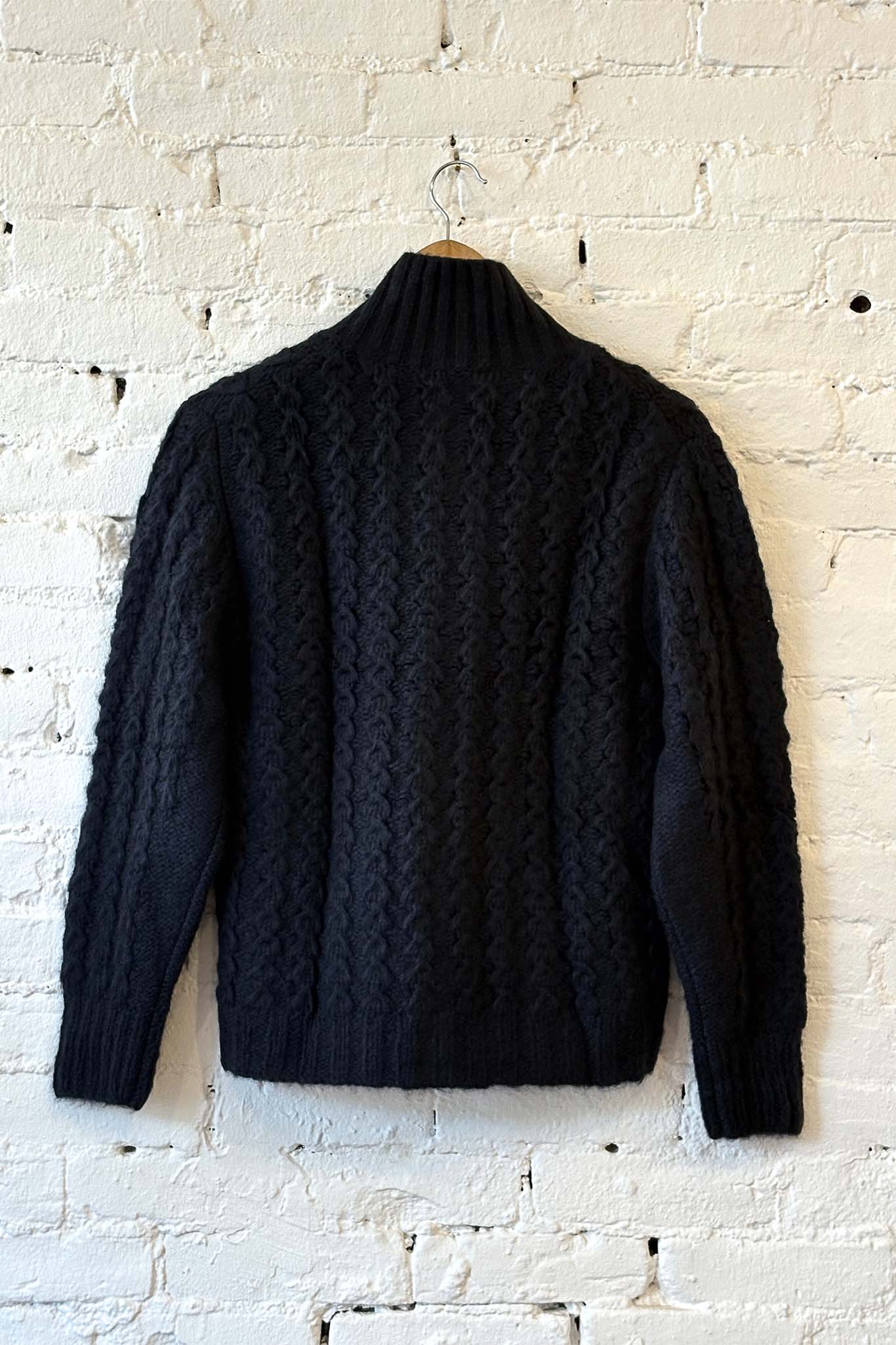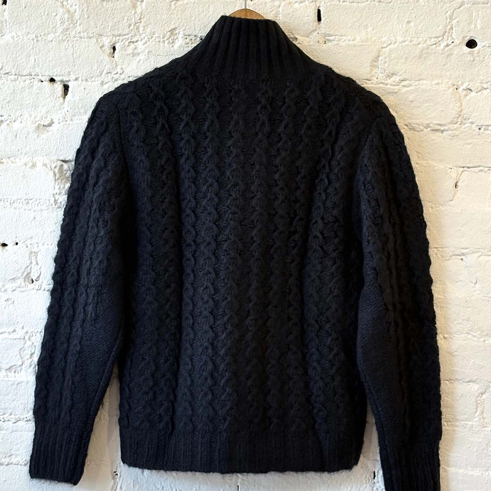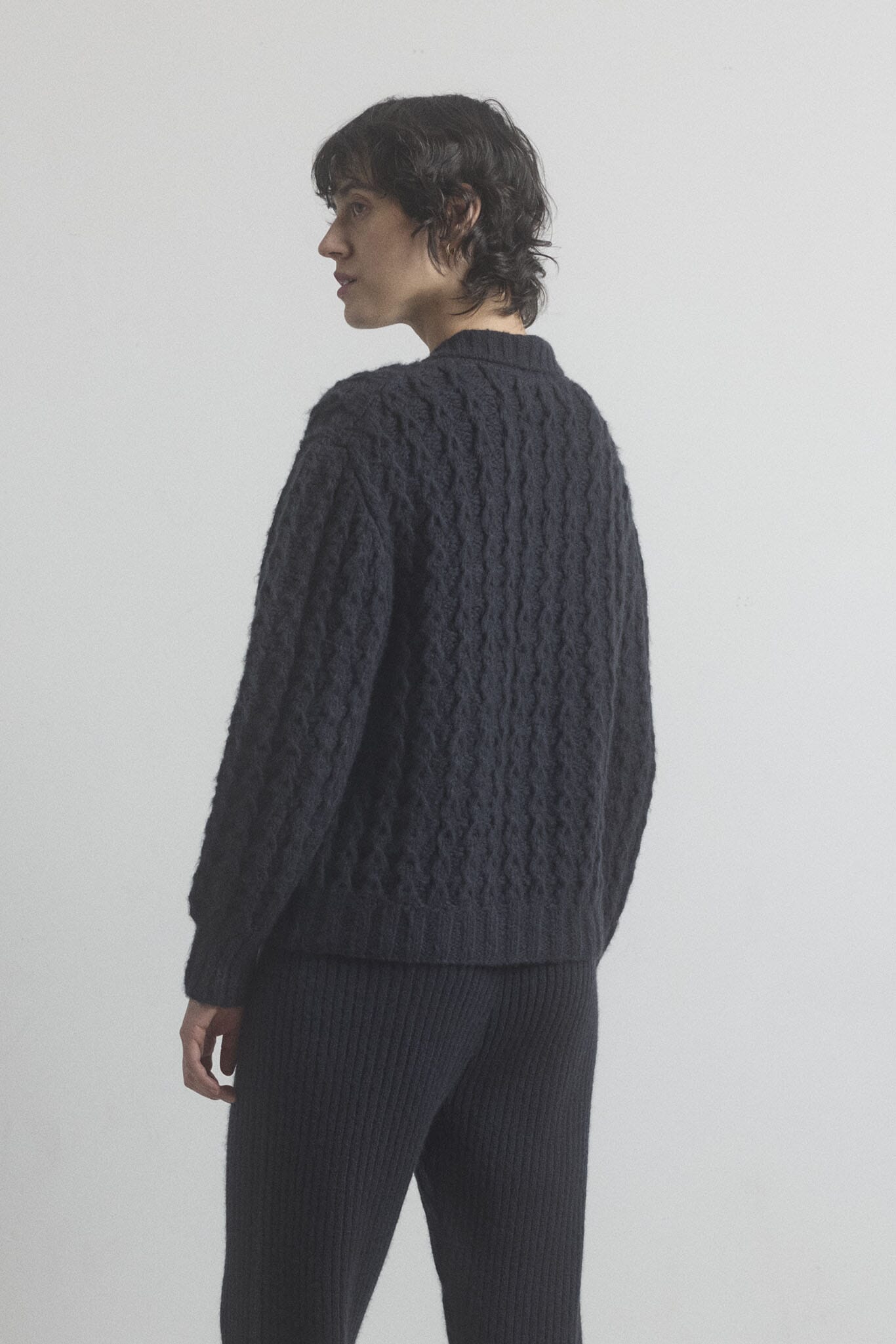 Textural hand knit merino cashmere cardigan with ribbed collar and welt pockets. Natural horn buttons.