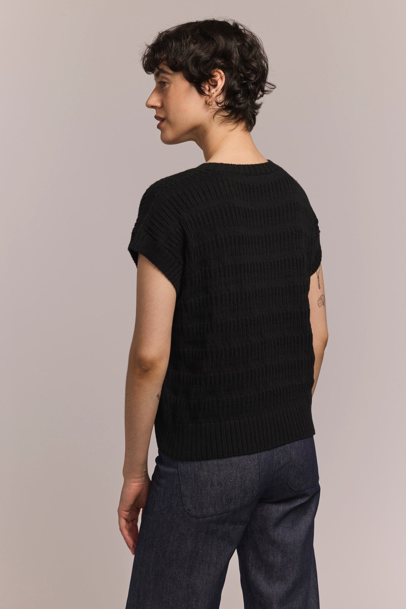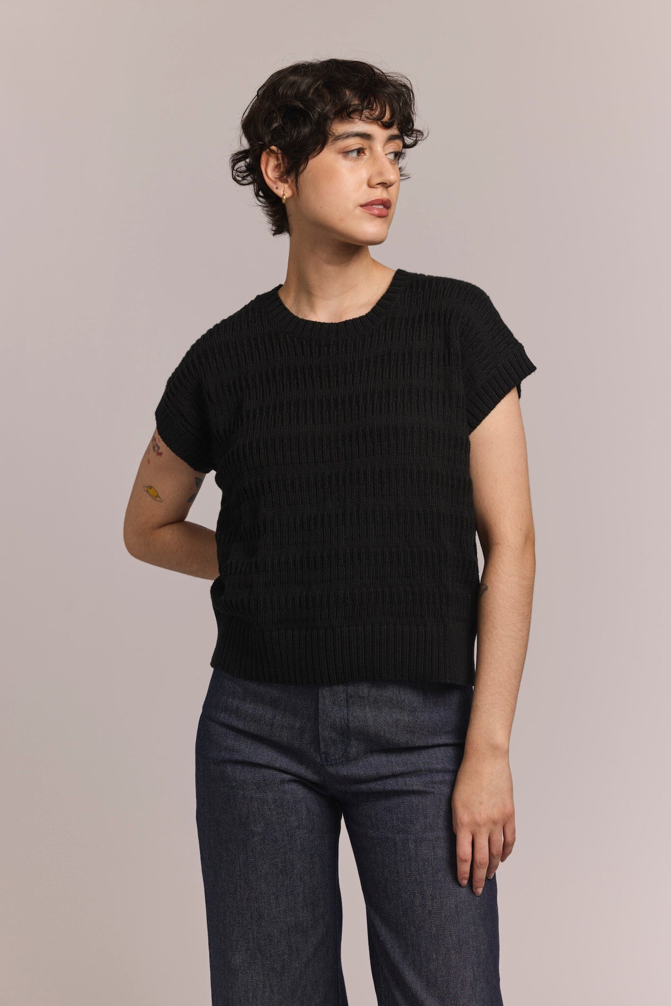 Hand machine knit with soft 100% cotton, the Charlotte Top is a lightweight textural sleeveless sweater that is a perfect addition to your versatile wardrobe. Wear it to the office or for a weekend brunch and pack it for a vacation away. Sleeves hit at the high bicep. Hem hits at the hip. Fair trade certified.