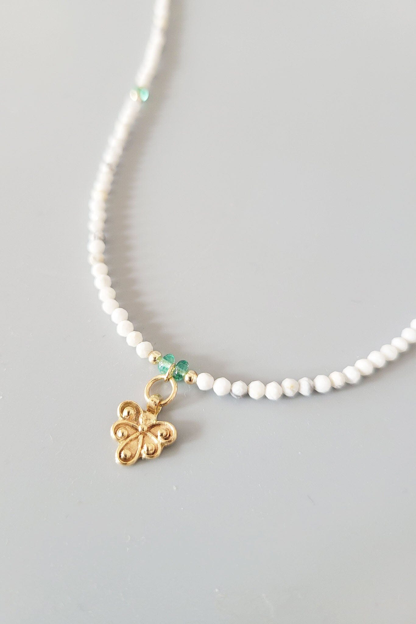 A delicate necklace, featuring a 14 karat gold Indian charm. Made with white howlite faceted stones, and light emerald and 14kt gold beads